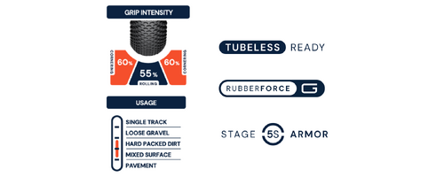 The Aggregate is the optimal all-around tire for paved, hardpack, and light gravel terrain. The evenly spaced knobs speed over smoother surfaces with minimal vibration while their hexagonal shape provides predictable handling over looser conditions. That is combined with our signature Rubberforce G tread compounds for impressive grip in the dirt and the new Stage 5S Armor construction offers both supreme ride quality and abrasion resistance.