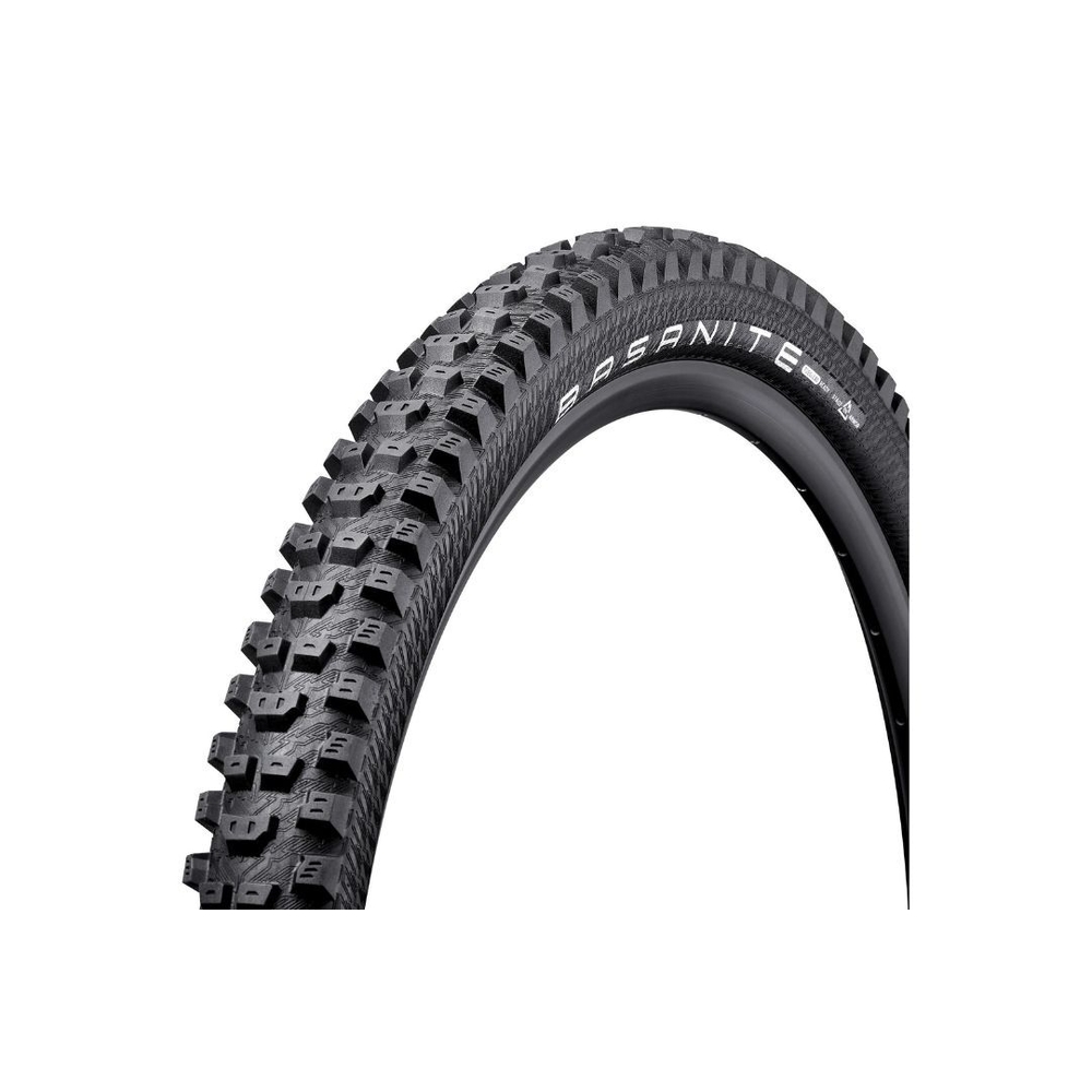 Loose berms, choppy trails, and rugged rock gardens stand no chance against the Basanite. The Basanite is designed as a rear tire with ramped knobs for improved speed that alternate in shape and size for braking control. Alternating shoulder lugs and central knobs provide grip at any angle. The large knobs all include hatch marks, or cupped profiles, improving grip on harder-packed terrain. For optimal performance, pair the Basanite with the Vulcanite on looser terrain or with the Tectonite in harder packed conditions.