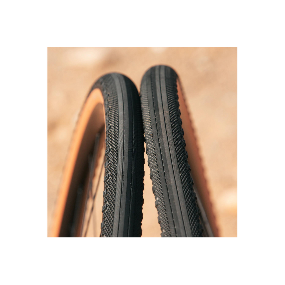 Kimberlite is a precious rock that often contains an even more valuable mineral — diamonds. The American Classic Kimberlite is as valuable to gravel riders as its namesake. For fast adventures on both pavement and gravel, look to the Kimberlite tire. This go-anywhere tire performs like a road tire on pavement and hooks up on hardpack dirt surfaces. The semi-slick tread starts with a smooth center for decreased rolling resistance on smoother surfaces, transitions through progressively more aggressive zones for maximum lateral traction and wraps up with robust edge knobs for dependable cornering. The Tubeless 120 TPI casing provides the ultimate construction for speed and comfort, and the Stage 5S Armor provides a tire that is lighter, faster, and more cut, tear, and abrasion resistant.