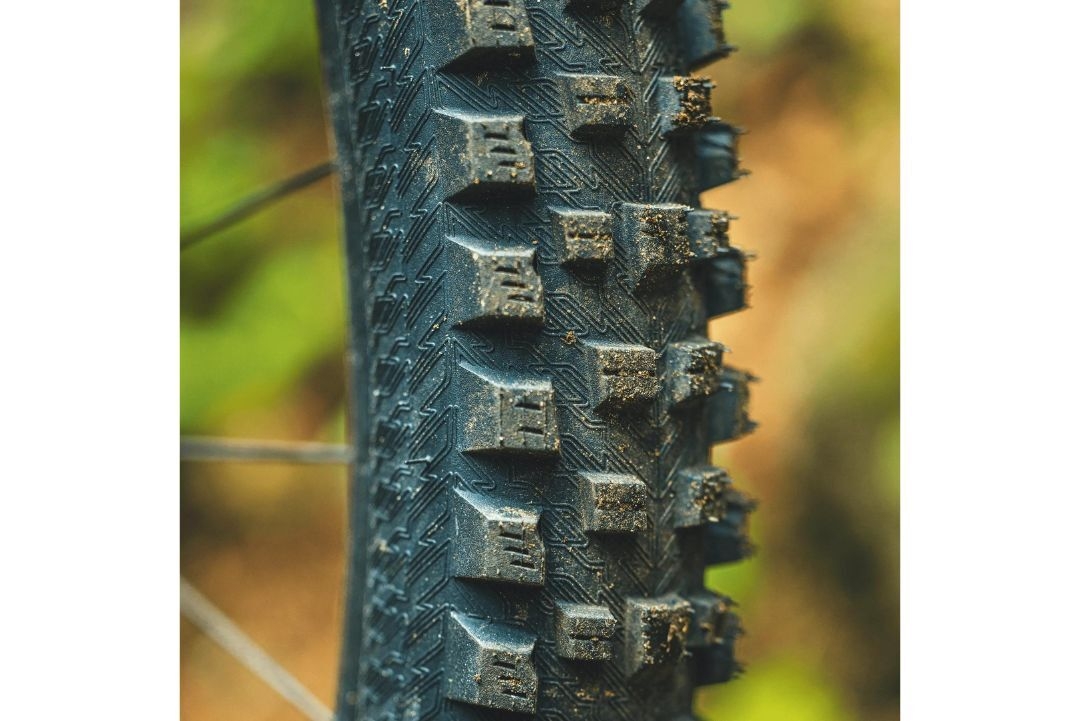 The Vulcanite is a go-anywhere tire featuring tall knobs for traction in loose terrain, hatch marks and siping for additional traction in packed conditions, and ramped central knobs for straight-line speed. And its semi-open tread block layout reduces debris build-up while increasing bite on rocky terrain and roots.