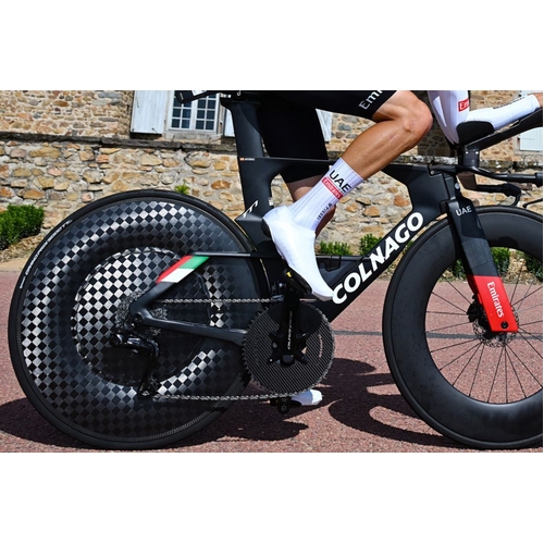 The optimization of the chainrings for high-speed competitions is achieved using Full Carbon single chainrings, used for two seasons on the UAE Team Emirates' time trial bikes. X-Aeroring: single chainrings made entirely of carbon fiber. The aerodynamic profile, wind tunnel tested, ensures low drag, while the narrow-wide tooth profile prevents chain drops, ensuring reliability and low friction.