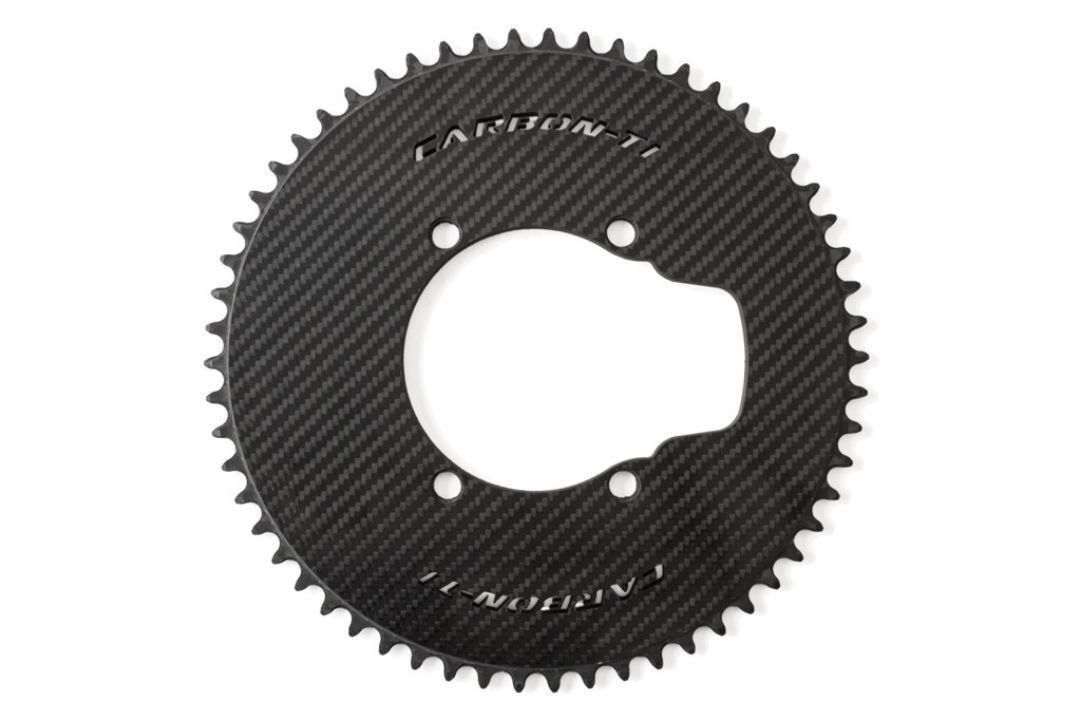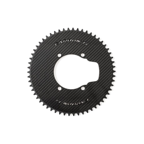 Aerodynamic chainring made of structural carbon fiber with a glossy 3K finish. Single chainring with 58 teeth and a bolt circle diameter (BCD) of 110 mm, 4 arms, compatible with Shimano Dura-Ace FC-R9200 and FC-R9200-P, Shimano Ultegra FC-R8100 and FC-R8100-P, and Shimano 105 FC-R7100 cranksets.