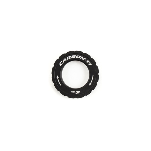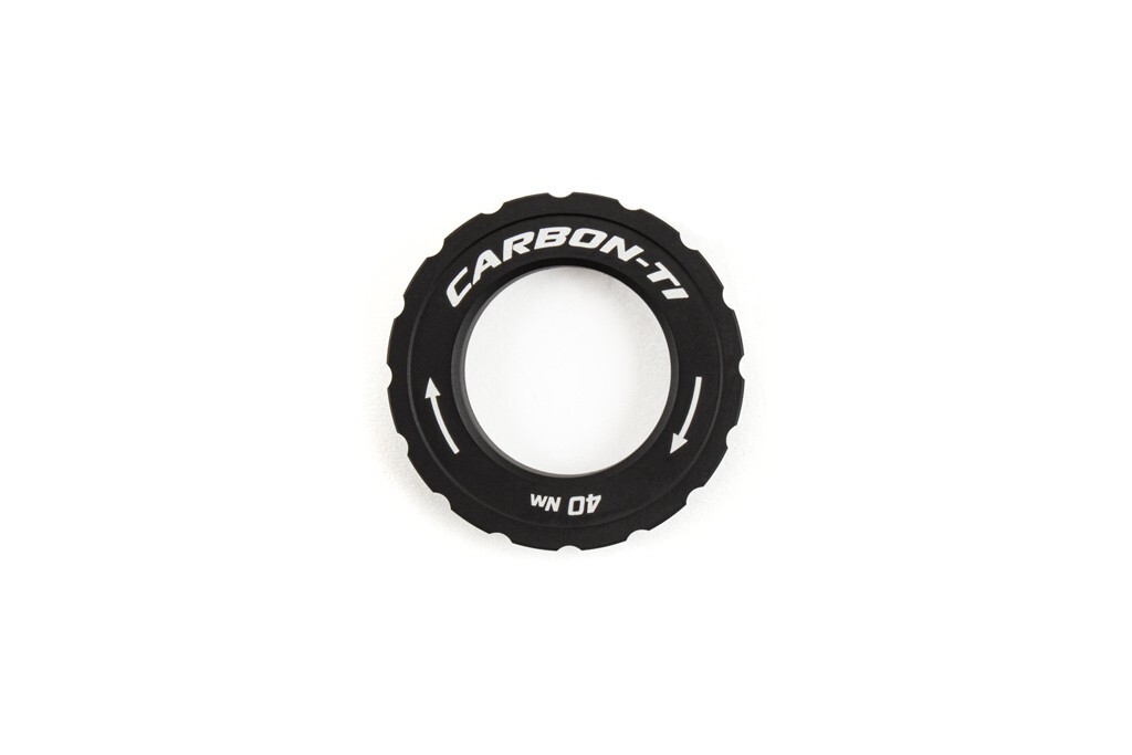 Ultra-light AL7075 Center Lock lockring, low-profile CNC-machined lock ring with laser-engraved Carbon-Ti logo.