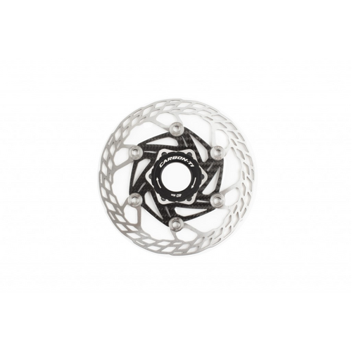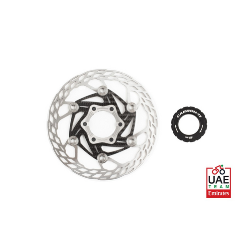 It is a superlight semi-floating disc rotor with a steel braking surface, a carbon fiber inner body, an Al7075 Center Lock specific Adapter, a laser-engraved titanium protection plate, and fixing rivets.