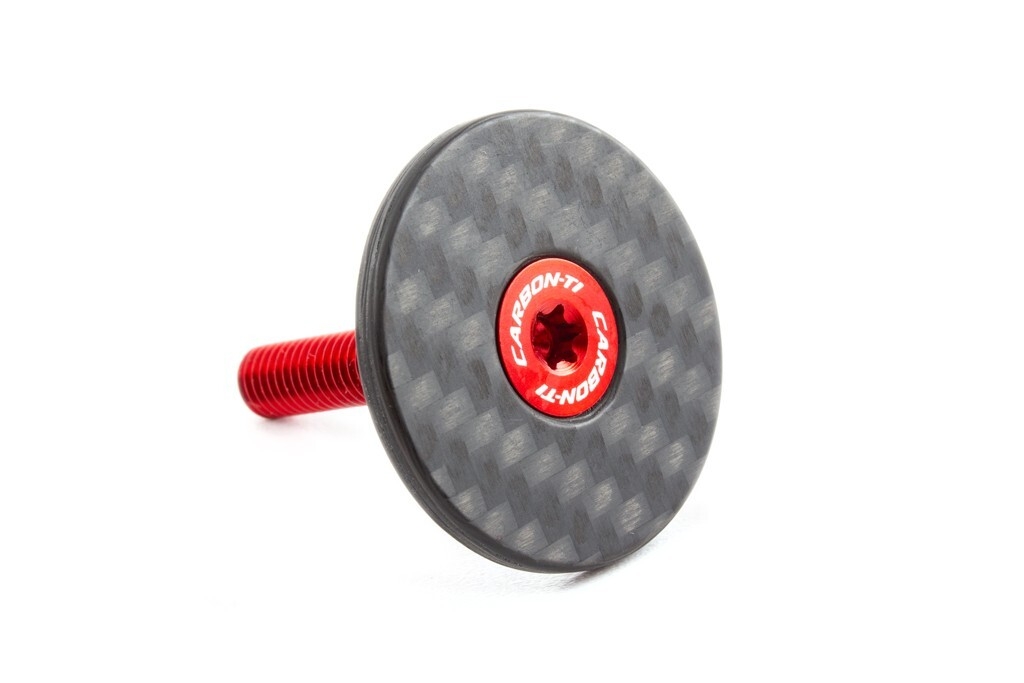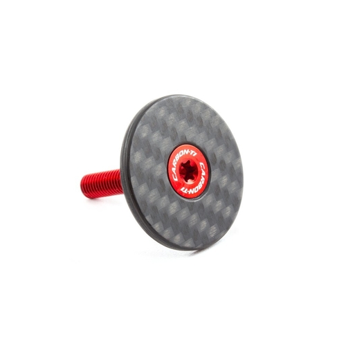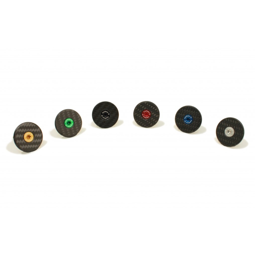 Superlight headset carbon cap, compatible with most 1 1/8" steerers, CNC machined, 3K glossy finishing with white graphics, supplied with a TORX 35mm Al7075-T6 anodized coloured bolt.